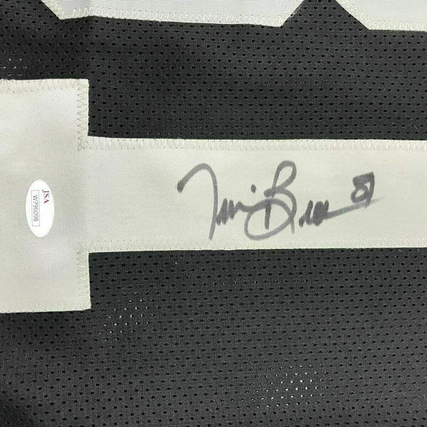 Framed Autographed/Signed Tim Brown 33x42 Oakland Black Football Jersey JSA COA