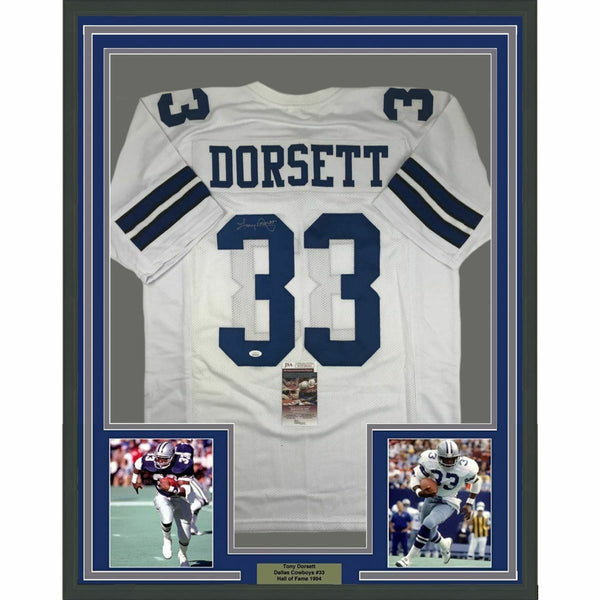 FRAMED Autographed/Signed TONY DORSETT 33x42 Dallas White Jersey JSA COA Auto The item is professionally framed & matted with two 8x10 photos, measures 33"x42" and is ready to be hung in your man cave! NOTE: COA card will be mounted on the back of the frame, not inside it on top of the jersey as seen in the picture.