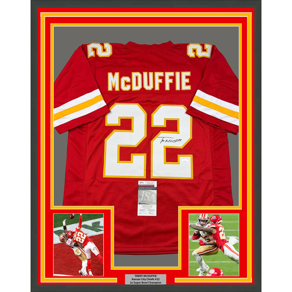 Framed Autographed/Signed Trent McDuffie 35x39 Kansas City Red Jersey JSA COA The item is professionally framed and matted with two 5x7 photos, measures 35x39 inches and is ready to be hung in your man cave! Photo and matting requests can be made.