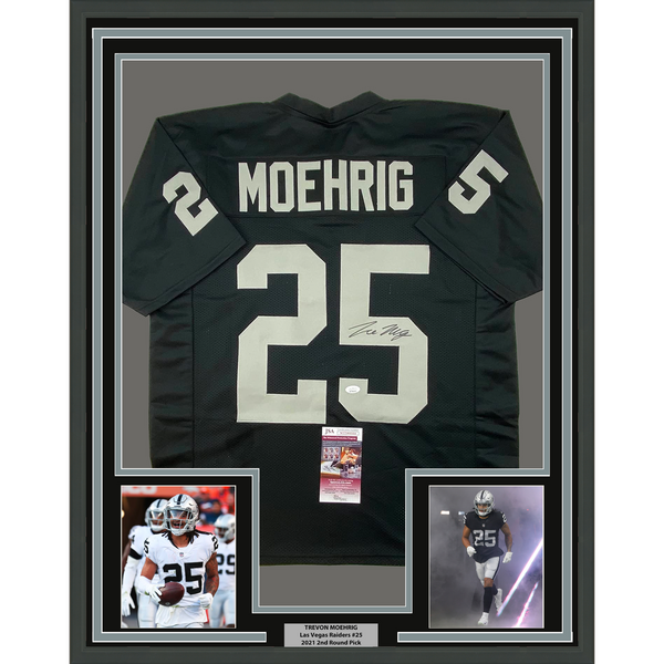 Framed Autographed/Signed Trevon Moehrig 33x42 LV Oakland Black Jersey JSA COA The item is professionally framed & matted with two 8x10 photos, measures 33"x42" and is ready to be hung in your man cave! NOTE: COA card will be mounted on the back of the frame, not inside it on top of the jersey as seen in the picture.