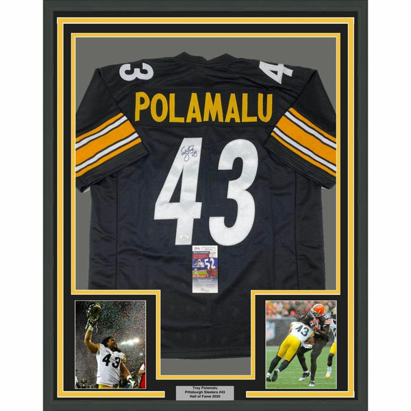 FRAMED Autographed/Signed TROY POLAMALU 33x42 Pittsburgh Black Jersey JSA COA The item is professionally framed & matted with two 8x10 photos, measures 33"x42" and is ready to be hung in your man cave! NOTE: COA card will be mounted on the back of the frame, not inside it on top of the jersey as seen in the picture.