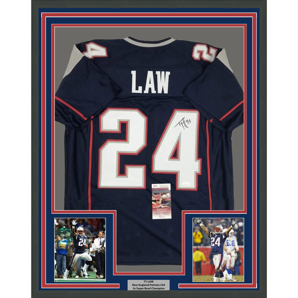 Framed Autographed/Signed Ty Law 35x39 New England Blue Football Jersey JSA COA The item is professionally framed and matted with two 5x7 photos, measures 35 inches by 39 inches and is ready to be hung in your man cave! Photo and matting requests can be made.