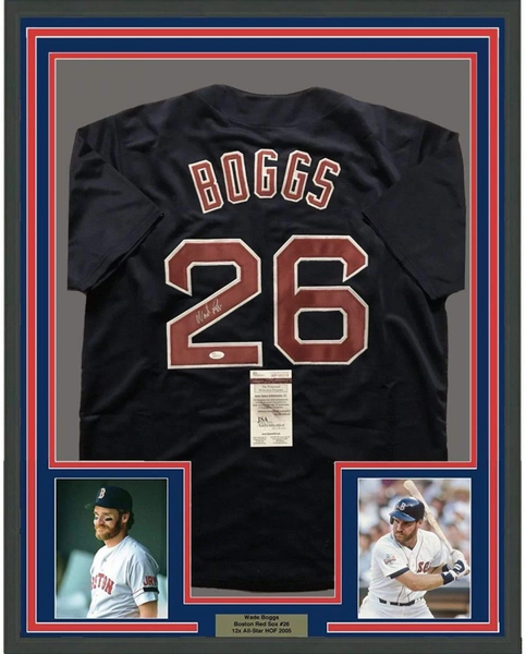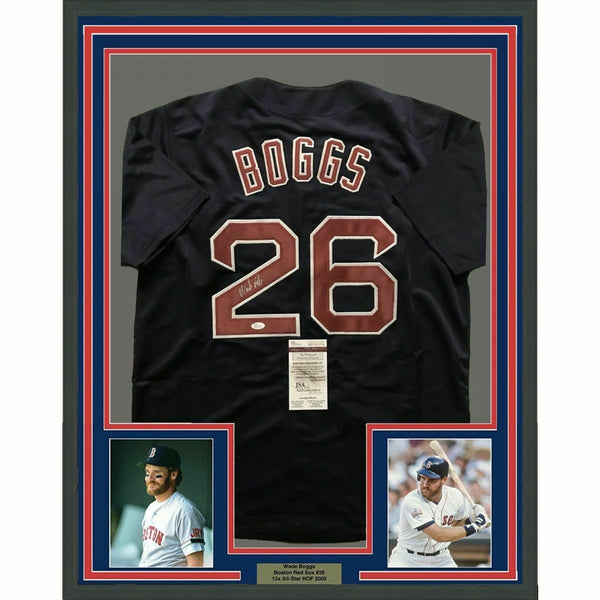 Framed Autographed/Signed Wade Boggs 33x42 Boston Blue Baseball Jersey JSA COA