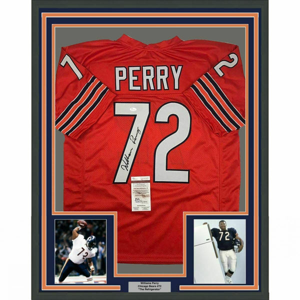 FRAMED Autographed/Signed WILLIAM PERRY Refrigerator 33x42 Orange Jersey JSA COA The item is professionally framed & matted with two 8x10 photos, measures 33"x42" and is ready to be hung in your man cave! NOTE: COA card will be mounted on the back of the frame, not inside it on top of the jersey as seen in the picture. Please allow up to 5 business days for the item to be framed, packaged safely, and picked up by USPS. Photo and matting requests can be made.