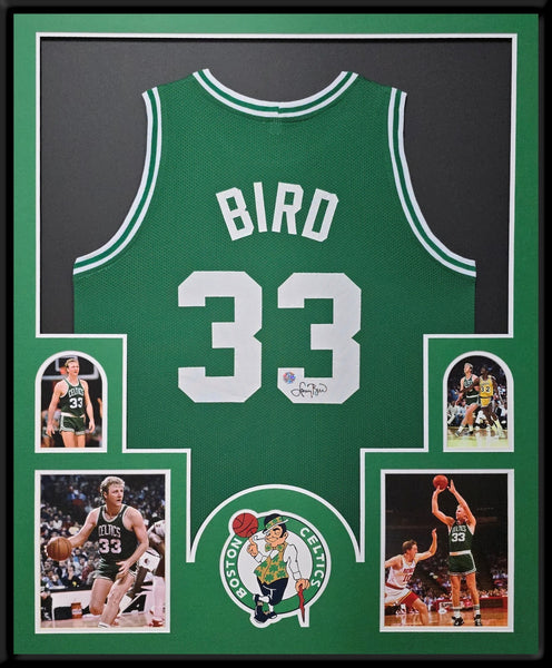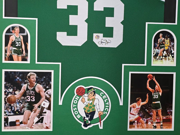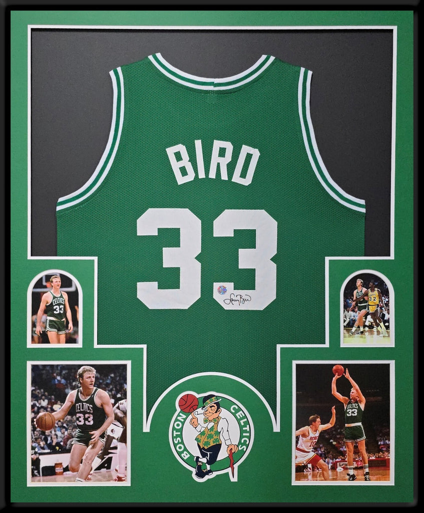 Custom Framed Larry Bird hand signed Boston Celtics style custom split jersey Larry Bird Hologram The authentication is from Larry Bird Hologram. This signature is WITNESSED by a representative of Larry Bird Hologram! 100% AUTHENTIC!!! The jersey has fully stitched numbers on the front and back. It is a great item and a must for all great sports fans! This item is professionally framed, it measures 32"x40" inside , 42"x34" outside , using UV protective Acrylic glass for safe keeping and safe transport, team color matting, black moulding and hanging hooks on the back. All additional items in frame seen in pictures included. 100% ready to hang in your fan cave.