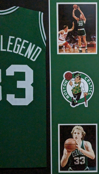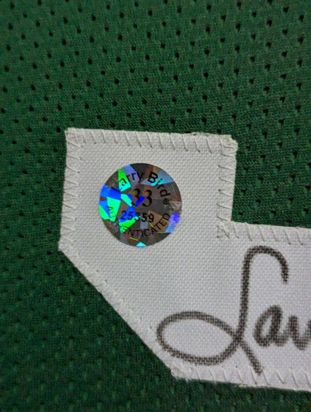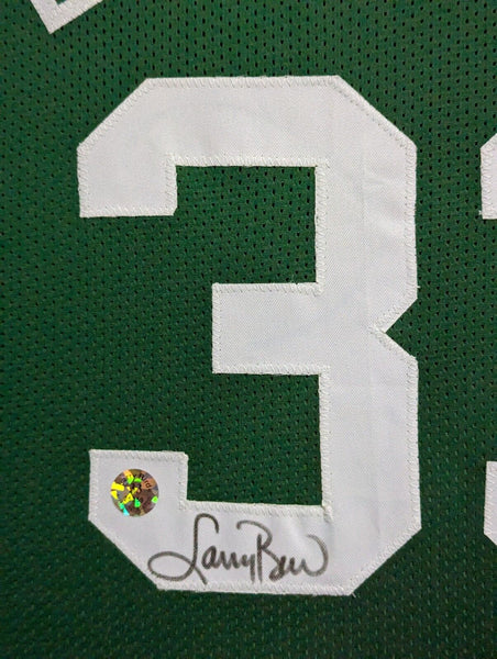 Custom Framed Larry Bird hand signed Boston Celtics style custom jersey Larry Bird Hologram The authentication is from Larry Bird Hologram. This signature is WITNESSED by a representative of Larry Bird Hologram! 100% AUTHENTIC!!! The jersey has fully stitched numbers on the front and back. It is a great item and a must for all great sports fans! This item is professionally framed, it measures 32"x40" inside , 42"x34" outside , using UV protective Acrylic glass for safe keeping and safe transport, team color matting, black moulding and hanging hooks on the back. All additional items in frame seen in pictures included. 100% ready to hang in your fan cave.