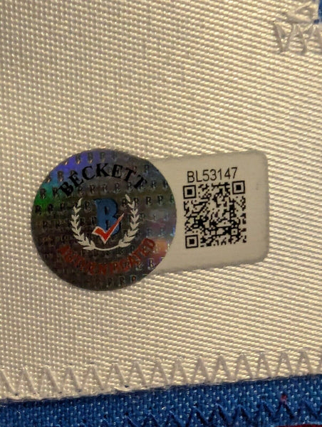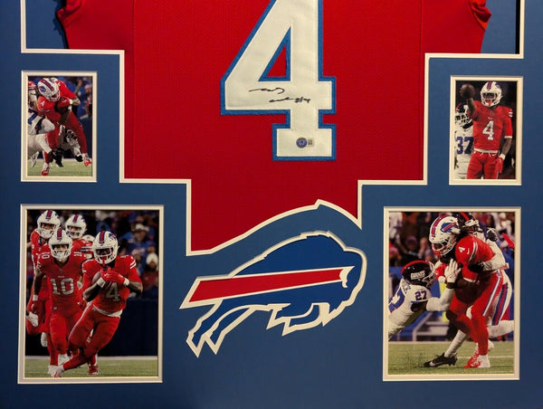 Custom Framed James Cook hand signed Buffalo Bills style custom jersey.Beckett HoloThe authentication is from Beckett. 100% AUTHENTIC!!! The jersey has fully stitched numbers on the front and back. It is a great item and a must for all great sports fans!This item is professionally framed, it measures 32"x40" inside , 42"x34" outside , using UV protective Acrylic glass for safe keeping and safe transport, team color matting, black moulding and hanging hooks on the back. All additional items in frame seen in pictures included. 100% ready to hang in your fan cave.