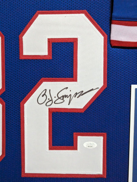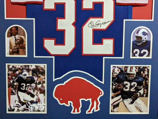 Custom Framed OJ Simpson hand signed Buffalo Bills style custom jersey.JSA Hologram and COAThe authentication is from JSA. 100% AUTHENTIC!!! The jersey has fully stitched numbers on the front and back. It is a great item and a must for all great sports fans!This item is professionally framed, it measures 32"x40" inside , 42"x34" outside , using UV protective Acrylic glass for safe keeping and safe transport, team color matting, black moulding and hanging hooks on the back. All additional items in frame seen in pictures included. 100% ready to hang in your fan cave.
