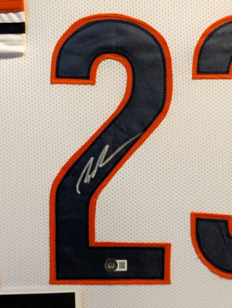 Custom Framed Roschon Johnson hand signed Chicago Bears style custom jersey.Beckett HologramThe authentication is from BAS. This signature is WITNESSED by a representative of BAS! 100% AUTHENTIC!!! The jersey has fully stitched numbers on the front and back. It is a great item and a must for all great sports fans!Stock photos are used for auctions. Will receive equal qualityThis item is professionally framed, it measures 32"x40" inside , 42"x34" outside , using UV protective Acrylic glass for safe keeping and safe transport, team color matting, black moulding and hanging hooks on the back. All additional items in frame seen in pictures included. 100% ready to hang in your fan cave.