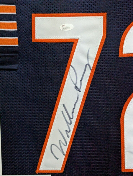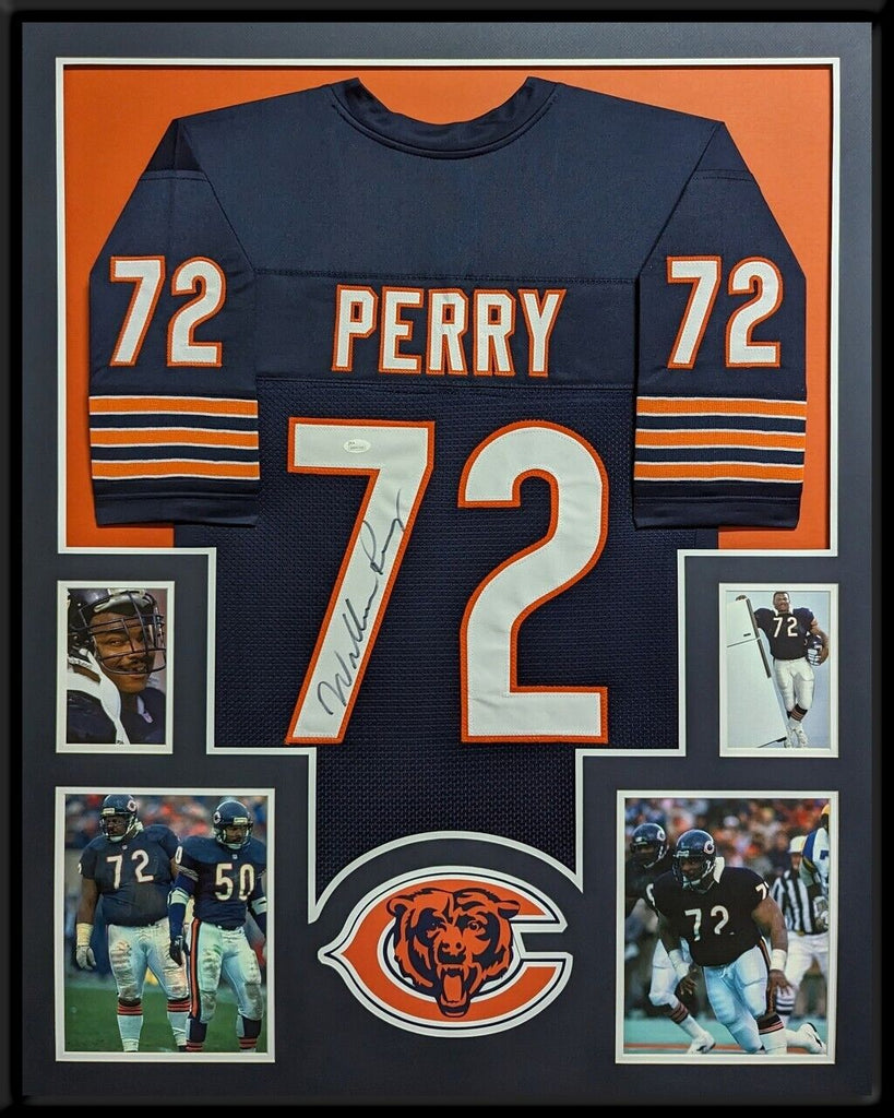 Custom Framed William "The Refrigerator" Perry hand signed Chicago Bears style custom jersey.JSA COAThe authentication is from JSA. This signature is WITNESSED by a representative of JSA! 100% AUTHENTIC!!! The jersey has fully stitched numbers on the front and back. It is a great item and a must for all great sports fans!Stock photos are used for auctions. Will receive equal qualityThis item is professionally framed, it measures 32"x40" inside , 42"x34" outside , using UV protective Acrylic glass for safe keeping and safe transport, team color matting, black moulding and hanging hooks on the back. All additional items in frame seen in pictures included. 100% ready to hang in your fan cave.