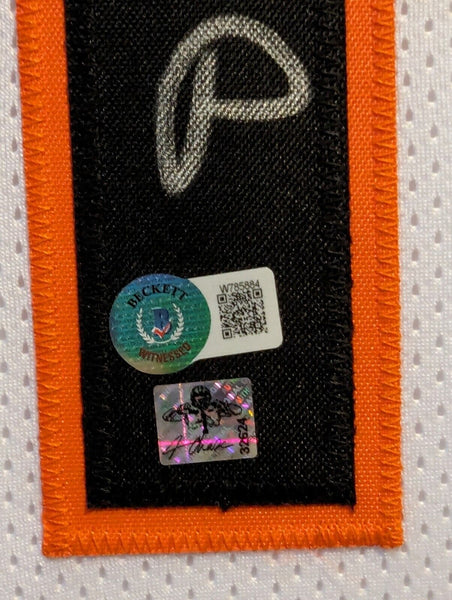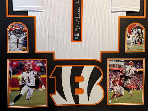 Custom Framed Jamarr Chase hand signed Cincinnati Bengals style custom jersey. Beckett Holo The authentication is from Beckett. This signature is authenticated by a representative of Beckett! 100% AUTHENTIC!!! The jersey has fully stitched numbers on the front and back. It is a great item and a must for all great sports fans! This item is professionally framed, it measures 32"x40" inside , 42"x34" outside , using UV protective Acrylic glass for safe keeping and safe transport, team color matting, black moulding and hanging hooks on the back. All additional items in frame seen in pictures included. 100% ready to hang in your fan cave.