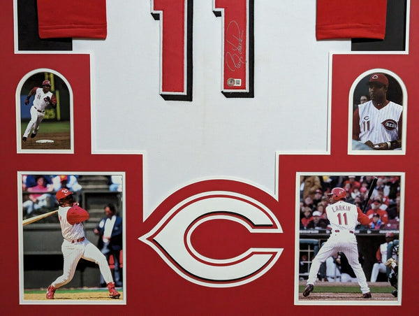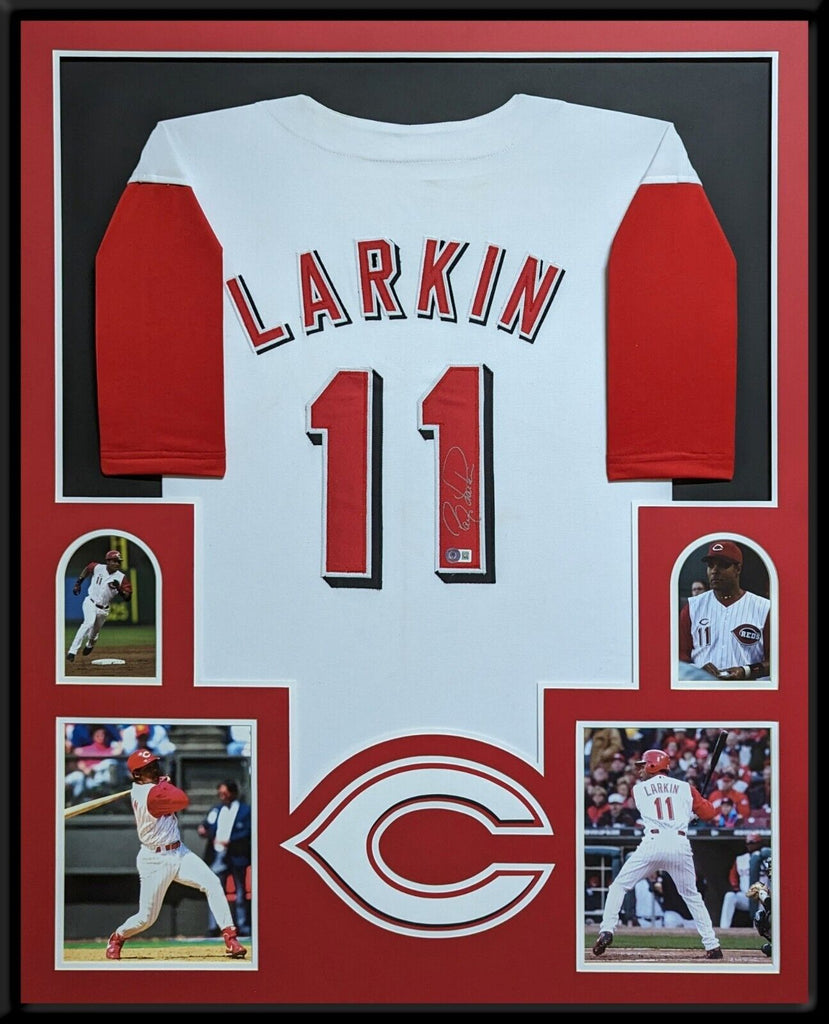 Framed Barry Larkin signed Cincinnati Reds Style Custom Jersey. Beckett HoloThe authentication is from Beckett. This signature is authenticated by a representative of Beckett! 100% AUTHENTIC!!! The jersey has fully stitched numbers on the front and back. No tags or logos. This is not an official MLB jersey but it is very high quality. It is a great item and a must for all great sports fans! This item is professionally framed, it measures 32"x40" inside , 42"x34" outside , using UV protective Acrylic glass for safe keeping and safe transport, team color matting, black moulding and hanging hooks on the back. All additional items in frame seen in pictures included. 100% ready to hang in your fan cave.