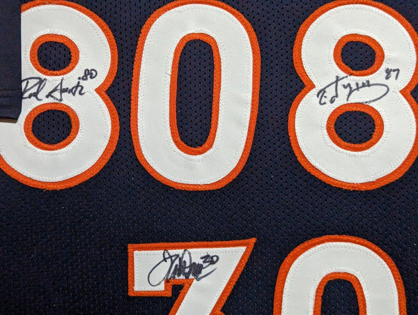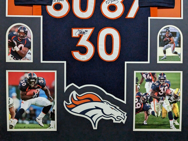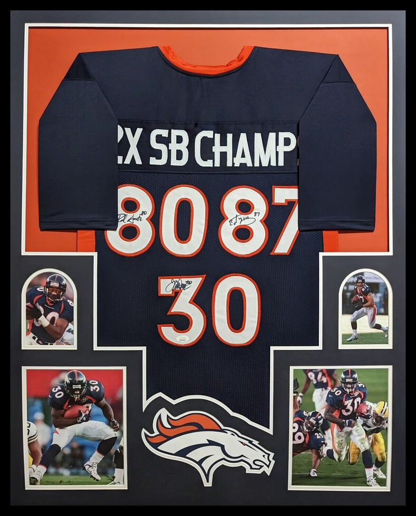 Custom Framed 3x signed Terrell Davis, Rod Smith, Ed McCaffrey hand signed Denver Broncos style 2X SB CHAMPS custom jersey.JSA Hologram and COAThe authentication is from JSA. This signature is WITNESSED by a representative of JSA! 100% AUTHENTIC!!! The jersey has fully stitched numbers on the front and back. It is a great item and a must for all great sports fans!Stock photos are used for auctions. Will receive equal quality.This item is professionally framed, it measures 32"x40" inside , 42"x34" outside , using UV protective Acrylic glass for safe keeping and safe transport, team color matting, black moulding and hanging hooks on the back. All additional items in frame seen in pictures included. 100% ready to hang in your fan cave.