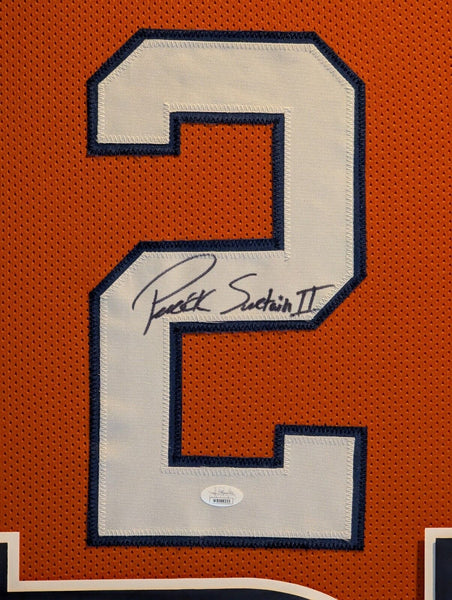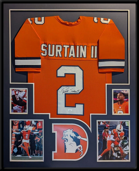 Framed Pat Surtain II hand signed Denver Broncos style Custom Jersey. JSA COA The authentication is from JSA. This signature is authenticated by a representative of JSA! 100% AUTHENTIC!!! The jersey has fully stitched numbers on the front and back. No tags or logos. This is not an official NFL jersey but it is very high quality. It is a great item and a must for all great sports fans! This item is professionally framed, it measures 32"x40" inside , 42"x34" outside , using UV protective Acrylic glass for safe keeping and safe transport, team color matting, black moulding and hanging hooks on the back. All additional items in frame seen in pictures included. 100% ready to hang in your fan cave.