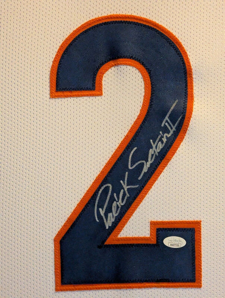 Framed Pat Surtain II hand signed Denver Broncos style Custom Jersey. JSA COA The authentication is from JSA. This signature is authenticated by a representative of JSA! 100% AUTHENTIC!!! The jersey has fully stitched numbers on the front and back. No tags or logos. This is not an official NFL jersey but it is very high quality. It is a great item and a must for all great sports fans! This item is professionally framed, it measures 32"x40" inside , 42"x34" outside , using UV protective Acrylic glass for safe keeping and safe transport, team color matting, black moulding and hanging hooks on the back. All additional items in frame seen in pictures included. 100% ready to hang in your fan cave.