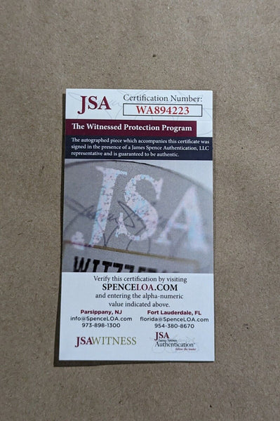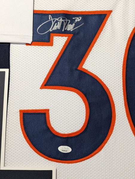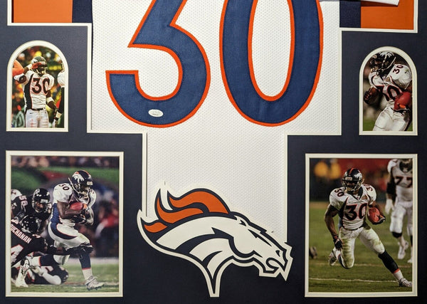 Custom Framed Terrell Davis hand signed Denver Broncos style custom jersey.JSA Hologram and COAThe authentication is from JSA. This signature is WITNESSED by a representative of JSA! 100% AUTHENTIC!!! The jersey has fully stitched numbers on the front and back. It is a great item and a must for all great sports fans!Stock photos are used for auctions. Will receive equal quality.This item is professionally framed, it measures 32"x40" inside , 42"x34" outside , using UV protective Acrylic glass for safe keeping and safe transport, team color matting, black moulding and hanging hooks on the back. All additional items in frame seen in pictures included. 100% ready to hang in your fan cave.
