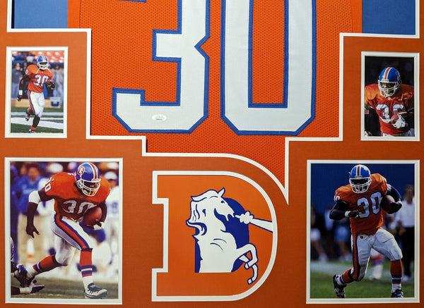 Custom Framed Terrell Davis hand signed Denver Broncos style custom jersey.JSA Hologram and COAThe authentication is from JSA. This signature is WITNESSED by a representative of JSA! 100% AUTHENTIC!!! The jersey has fully stitched numbers on the front and back. It is a great item and a must for all great sports fans!Stock photos are used for auctions. Will receive equal quality.This item is professionally framed, it measures 32"x40" inside , 42"x34" outside , using UV protective Acrylic glass for safe keeping and safe transport, team color matting, black moulding and hanging hooks on the back. All additional items in frame seen in pictures included. 100% ready to hang in your fan cave.