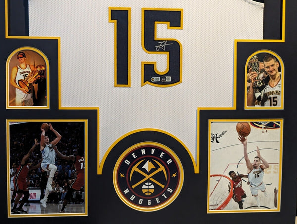 Custom Framed signed Nikola Jokic Denver Nuggets style custom jersey Beckett Hologram The authentication is from Beckett. This signature is authenticated by a representative of Beckett! 100% AUTHENTIC!!! The jersey has fully stitched numbers on the front and back. It is a great item and a must for all great sports fans! This item is professionally framed, it measures 32"x40" inside , 42"x34" outside , using UV protective Acrylic glass for safe keeping and safe transport, team color matting, black moulding and hanging hooks on the back. All additional items in frame seen in pictures included. 100% ready to hang in your fan cave.