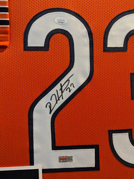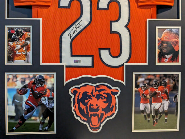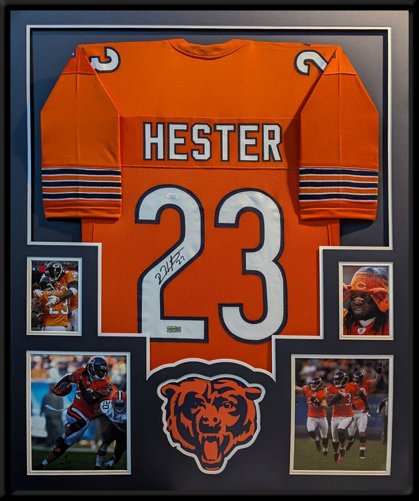 Custom Framed Devin Hester hand signed Chicago Bears style custom jersey.JSA Hologram and COAThe authentication is from JSA. This signature is authenticated by a representative of JSA! 100% AUTHENTIC!!! The jersey has fully stitched numbers on the front and back. It is a great item and a must for all great sports fans!Stock photos are used for auctions. Will receive equal quality.This item is professionally framed, it measures 32"x40" inside , 42"x34" outside , using UV protective Acrylic glass for safe keeping and safe transport, team color matting, black moulding and hanging hooks on the back. All additional items in frame seen in pictures included. 100% ready to hang in your fan cave.