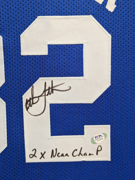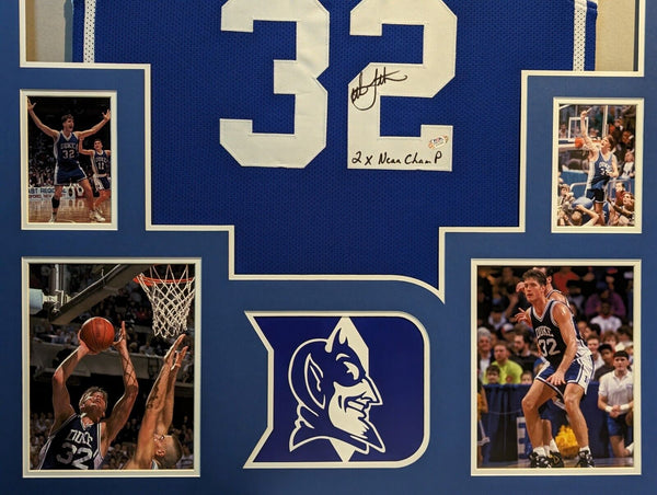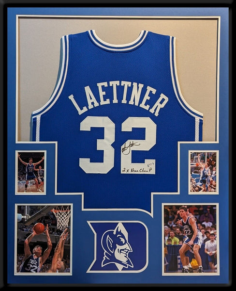 Custom Framed Christian Laettner hand signed Duke Blue Devils style custom jersey"2x Ncaa Champ" Inscribed PSA Hologram and COA The authentication is from PSA. This signature is WITNESSED by a representative of PSA! 100% AUTHENTIC!!! The jersey has fully stitched numbers on the front and back. It is a great item and a must for all great sports fans! This item is professionally framed, it measures 32"x40" inside , 42"x34" outside , using UV protective Acrylic glass for safe keeping and safe transport, team color matting, black moulding and hanging hooks on the back. All additional items in frame seen in pictures included. 100% ready to hang in your fan cave.
