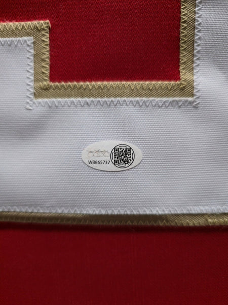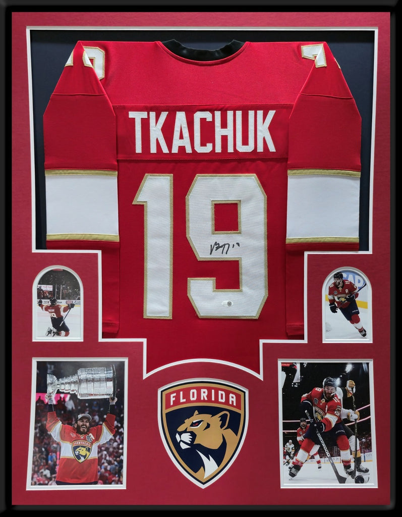 Custom Framed in Matthew Tkachuk hand signed Florida Panthers jersey. JSA COA The authentication is from JSA. This signature is authenticated by a representative of JSA! 100% AUTHENTIC!!! The jersey has fully stitched numbers on the front and back. It is a great item and a must for all great sports fans! This item is professionally framed, it measures 32"x40" inside , 42"x34" outside , using UV protective Acrylic glass for safe keeping and safe transport, SUEDE team color matting, black moulding and hanging hooks on the back. All additional items in frame seen in pictures included. 100% ready to hang in your fan cave.