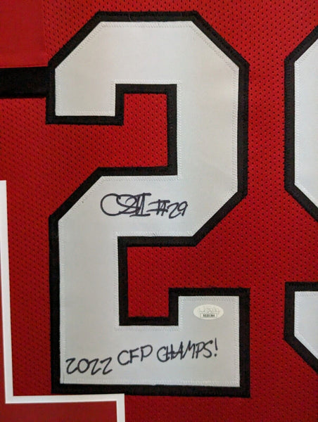Framed Chris Smith hand signed Georgia Bulldogs style custom jersey."2022 CFP CHAMPS!" JSA Hologram and COA The authentication is from JSA. This signature is WITNESSED by a representative of JSA! 100% AUTHENTIC!!! The jersey has fully stitched numbers on the front and back. No tags or logos. This is not an official NCAA jersey but it is very high quality. It is a great item and a must for all great sports fans! This item is professionally framed, it measures 32"x40" inside , 42"x34" outside , using UV protective Acrylic glass for safe keeping and safe transport, team color matting, black moulding and hanging hooks on the back. All additional items in frame seen in pictures included. 100% ready to hang in your fan cave.