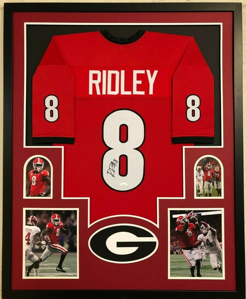 Framed Riley Ridley hand signed Georgia Bulldogs custom jersey. JSA Hologram and COA(WPP359553) The authentication is from JSA. This signature is not authenticated by opinion but it is WITNESSED by a representative of JSA! 100% AUTHENTIC!!! The jersey has fully stitched numbers on the front and back. No tags or logos. This is not an official NCAA jersey but it is very high quality. It is a great item and a must for all great sports fans! This item is professionally framed, it measures 32"x40" inside , 42"x34" outside , using UV protective Acrylic glass for safe keeping and safe transport, team color matting, black moulding and hanging hooks on the back. All additional items in frame seen in pictures included. 100% ready to hang in your fan cave.