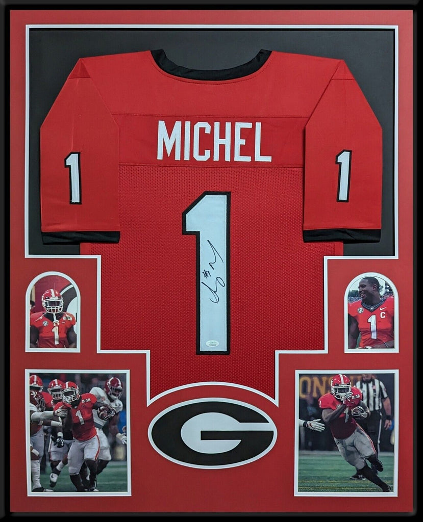 Framed Sony Michel hand signed Georgia Bulldogs style custom jersey. JSA Hologram and COA The authentication is from JSA. This signature is WITNESSED by a representative of JSA! 100% AUTHENTIC!!! The jersey has fully stitched numbers on the front and back. No tags or logos. This is not an official NCAA jersey but it is very high quality. It is a great item and a must for all great sports fans! This item is professionally framed, it measures 32"x40" inside , 42"x34" outside , using UV protective Acrylic glass for safe keeping and safe transport, team color matting, black moulding and hanging hooks on the back. All additional items in frame seen in pictures included. 100% ready to hang in your fan cave.