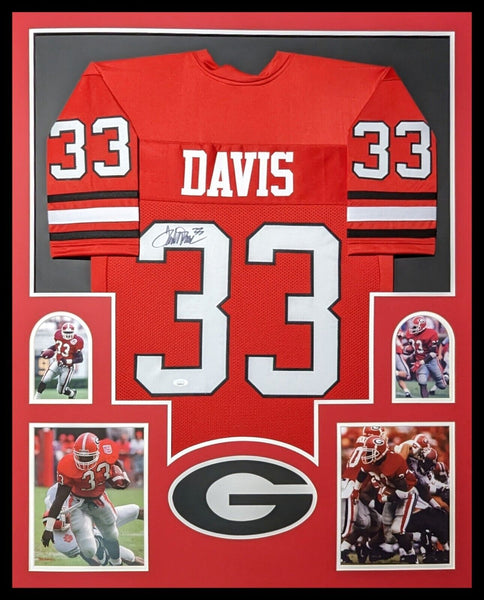 Custom Framed Terrell Davis hand signed Georgia Bulldogs style custom jersey. JSA Certification - stock image used The authentication is from JSA. This signature is authenticated by a representative of JSA! 100% AUTHENTIC!!! The jersey has fully stitched numbers on the front and back. It is a great item and a must for all great sports fans! This item is professionally framed, it measures 32"x40" inside , 42"x34" outside , using UV protective Acrylic glass for safe keeping and safe transport, team color matting, black moulding and hanging hooks on the back. All additional items in frame seen in pictures included. 100% ready to hang in your fan cave.