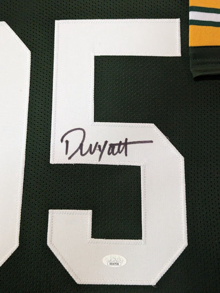 Framed Devonte Wyatt signed Green Bay Packers style Custom Jersey. JSA Hologram and COA The authentication is from JSA. This signature is WITNESSED by a representative of JSA! 100% AUTHENTIC!!! The jersey has fully stitched numbers on the front and back. No tags or logos. This is not an official NFL jersey but it is very high quality. It is a great item and a must for all great sports fans! This item is professionally framed, it measures 32"x40" inside , 42"x34" outside , using UV protective Acrylic glass for safe keeping and safe transport, team color matting, black moulding and hanging hooks on the back. All additional items in frame seen in pictures included. 100% ready to hang in your fan cave.