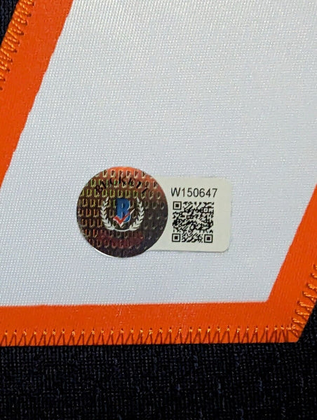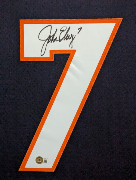 Custom Framed in SUEDE John Elway signed Denver Broncos style custom jersey. Beckett Hologram The authentication is from BAS. This signature is authenticated by a representative of BAS! 100% AUTHENTIC!!! The jersey has fully stitched numbers on the front and back. No tags or logos. This is not an official NFL jersey but it is very high quality. It is a great item and a must for all great sports fans! This item is professionally framed, it measures 32"x40" inside , 42"x34" outside , using UV protective Acrylic glass for safe keeping and safe transport, team color SUEDE matting, black moulding and hanging hooks on the back. All additional items in frame seen in pictures included. 100% ready to hang in your fan cave.