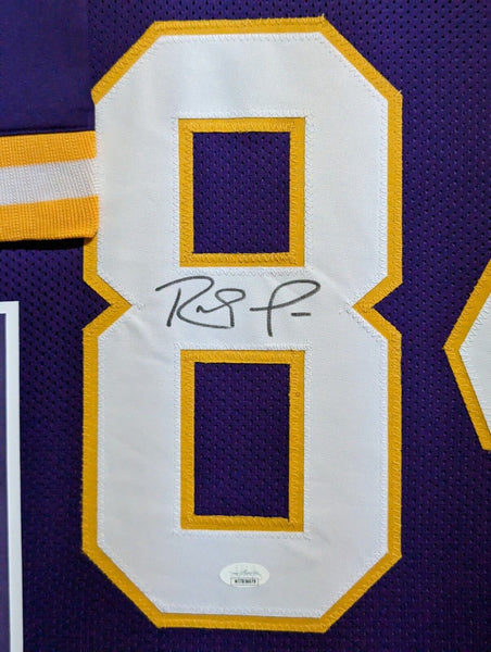Custom Framed in SUEDE Randy Moss hand signed Minnesota Vikings style custom jersey.JSA Hologram and COAThe authentication is from JSA. This signature is authenticated by a representative of JSA! 100% AUTHENTIC!!! The jersey has fully stitched numbers on the front and back. It is a great item and a must for all great sports fans!Stock photos are used for auctions. Will receive equal quality.This item is professionally framed, it measures 32"x40" inside , 42"x34" outside , using UV protective Acrylic glass for safe keeping and safe transport, team color SUEDE matting, black moulding and hanging hooks on the back. All additional items in frame seen in pictures included. 100% ready to hang in your fan cave.