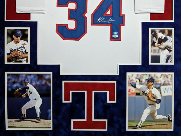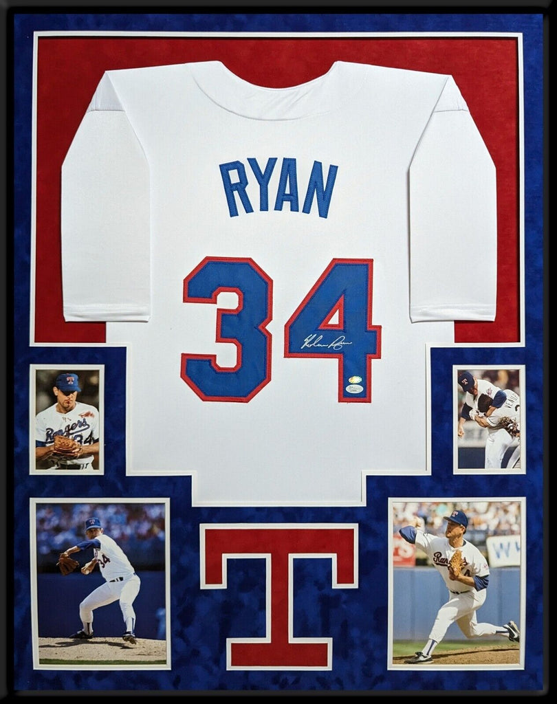 Custom Framed in SUEDE Nolan Ryan hand signed Texas Rangers style custom jersey.JSA Hologram and COAThe authentication is from JSA. This signature is authenticated by a representative of JSA! 100% AUTHENTIC!!! The jersey has fully stitched numbers on the front and back. It is a great item and a must for all great sports fans!This item is professionally framed, it measures 32"x40" inside , 42"x34" outside , using UV protective Acrylic glass for safe keeping and safe transport, team SUEDE color matting, black moulding and hanging hooks on the back. All additional items in frame seen in pictures included. 100% ready to hang in your fan cave.