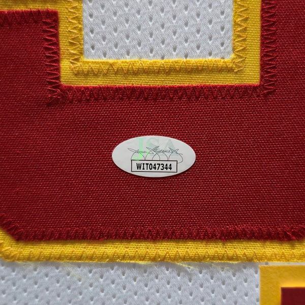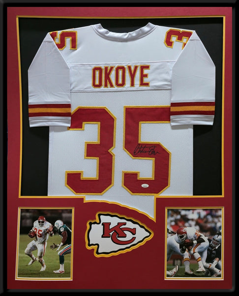 Custom Framed Christian Okoye hand signed Kansas City Chiefs style custom jersey. JSA Hologram and COA The authentication is from JSA. This signature is WITNESSED by a representative of JSA! 100% AUTHENTIC!!! The jersey has fully stitched numbers on the front and back. It is a great item and a must for all great sports fans! This item is professionally framed, it measures 32"x40" inside , 42"x34" outside , using UV protective Acrylic glass for safe keeping and safe transport, team color matting, black moulding and hanging hooks on the back. All additional items in frame seen in pictures included. 100% ready to hang in your fan cave.
