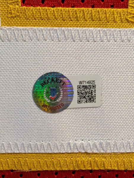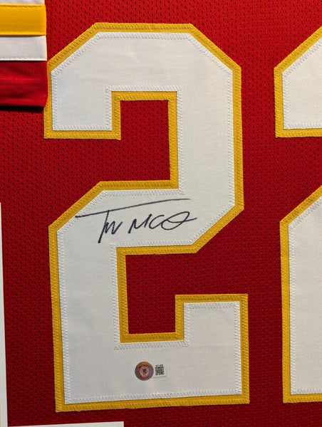 Custom Framed Trent McDuffie hand signed Kansas City Chiefs style custom jersey. Beckett Hologram The authentication is from Beckett. This signature is WITNESSED by a representative of Beckett! 100% AUTHENTIC!!! The jersey has fully stitched numbers on the front and back. It is a great item and a must for all great sports fans! This item is professionally framed, it measures 32"x40" inside , 42"x34" outside , using UV protective Acrylic glass for safe keeping and safe transport, team color matting, black moulding and hanging hooks on the back. All additional items in frame seen in pictures included. 100% ready to hang in your fan cave.