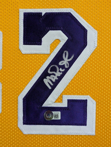 Custom Framed Magic Johnson hand signed L.A. Lakers style custom jersey.Beckett HologramThe authentication is from Beckett. This signature is WITNESSED by a representative of Beckett! 100% AUTHENTIC!!! The jersey has fully stitched numbers on the front and back. It is a great item and a must for all great sports fans!This item is professionally framed, it measures 32"x40" inside , 42"x34" outside , using team color matting, UV protective Acrylic glass for safe keeping and safe transport, team color matting, black moulding and hanging hooks on the back. All additional items in frame seen in pictures included. 100% ready to hang in your fan cave.