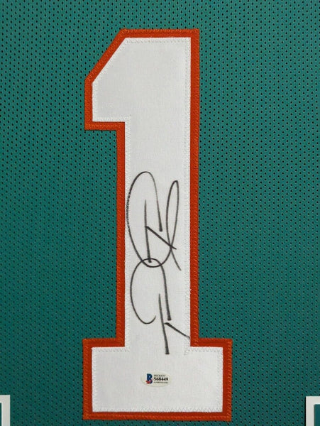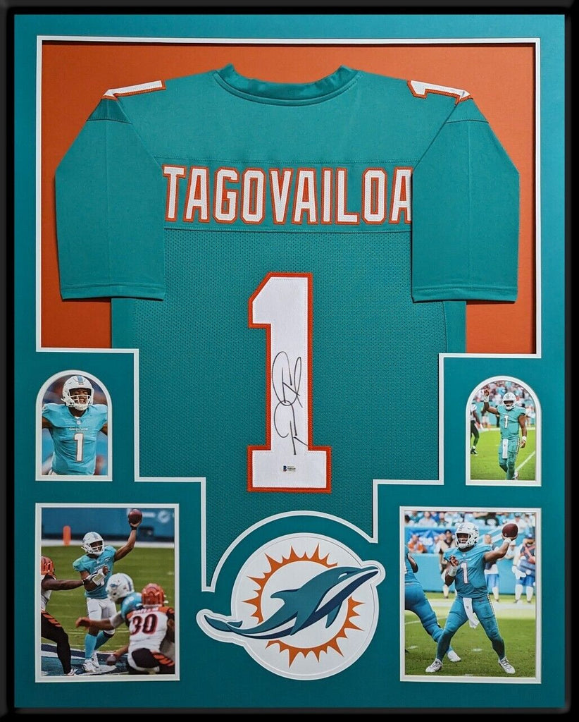 Custom Framed Tua Tagovailoa hand signed Miami Dolphins style custom jersey.Beckett COAThe authentication is from Beckett. This signature is authenticated by a representative of Beckett! 100% AUTHENTIC!!! The jersey has fully stitched numbers on the front and back. It is a great item and a must for all great sports fans!This item is professionally framed, it measures 32"x40" inside , 42"x34" outside , using UV protective Acrylic glass for safe keeping and safe transport, team color matting, black moulding and hanging hooks on the back. All additional items in frame seen in pictures included. 100% ready to hang in your fan cave.