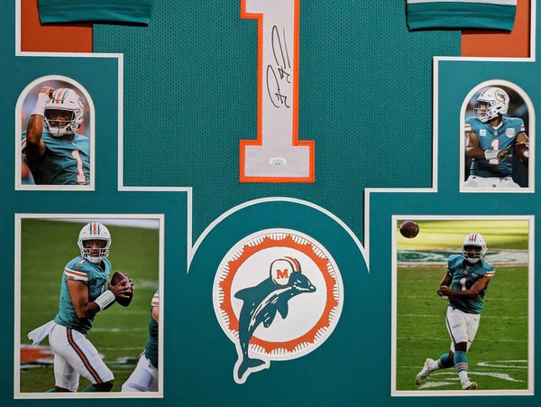 Custom Framed Tua Tagovailoa hand signed Miami Dolphins style custom jersey.JSA COAThe authentication is from JSA. This signature is authenticated by a representative of JSA! 100% AUTHENTIC!!! The jersey has fully stitched numbers on the front and back. It is a great item and a must for all great sports fans!This item is professionally framed, it measures 32"x40" inside , 42"x34" outside , using UV protective Acrylic glass for safe keeping and safe transport, team color matting, black moulding and hanging hooks on the back. All additional items in frame seen in pictures included. 100% ready to hang in your fan cave.