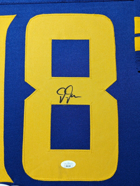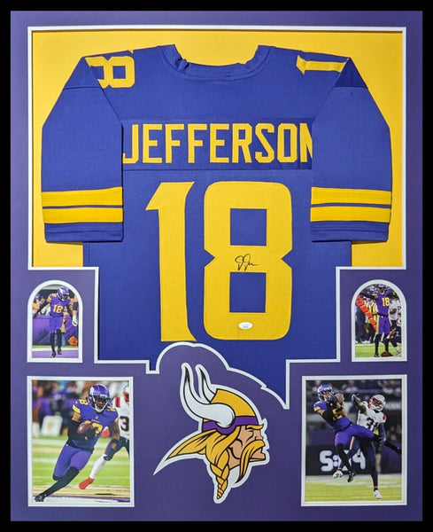 Custom Framed Justin Jefferson hand signed Minnesota Vikings style custom jersey.JSA Hologram and COAThe authentication is from JSA. This signature is WITNESSED by a representative of JSA! 100% AUTHENTIC!!! The jersey has fully stitched numbers on the front and back. It is a great item and a must for all great sports fans!Stock photos are used for auctions. Will receive equal quality.This item is professionally framed, it measures 32"x40" inside , 42"x34" outside , using UV protective Acrylic glass for safe keeping and safe transport, team color matting, black moulding and hanging hooks on the back. All additional items in frame seen in pictures included. 100% ready to hang in your fan cave.