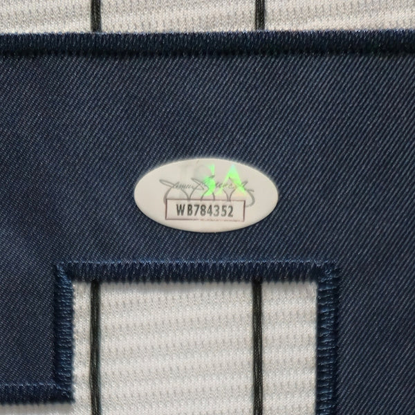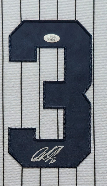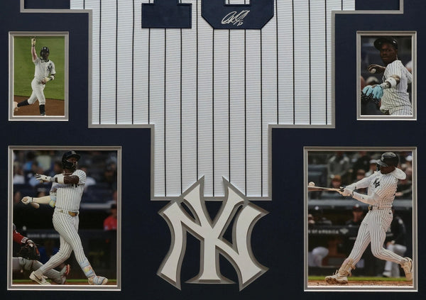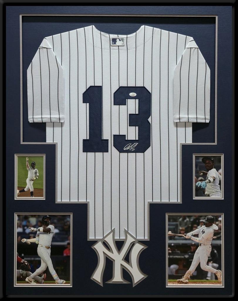 Custom Framed Jazz Chisholm Jr hand signed N.Y. Yankees jersey.JSA COAThe authentication is from JSA. This signature is WITNESSED by a representative of JSA! 100% AUTHENTIC!!! The jersey has fully stitched numbers on the front and back. It is a great item and a must for all great sports fans!This item is professionally framed, it measures 32"x40" inside , 42"x34" outside , using UV protective Acrylic glass for safe keeping and safe transport, team color matting, black moulding and hanging hooks on the back. All additional items in frame seen in pictures included. 100% ready to hang in your fan cave.