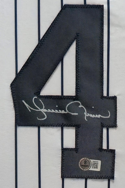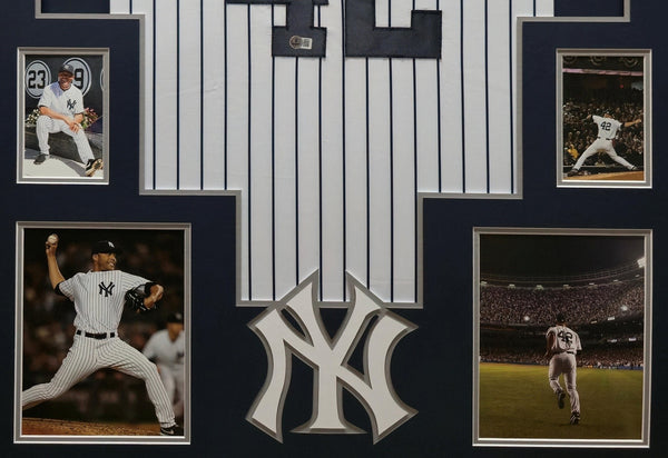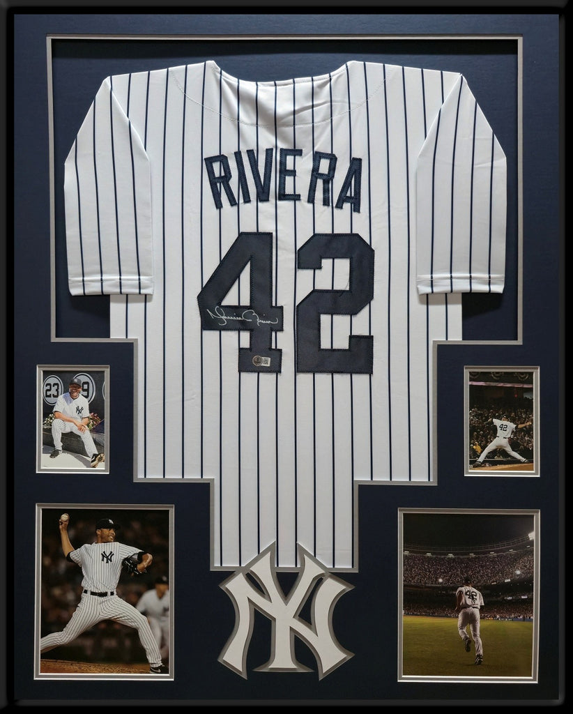 Custom Framed Mariano Rivera hand signed N.Y. Yankees jersey.Beckett HologramThe authentication is from BAS. This signature is WITNESSED by a representative of BAS! 100% AUTHENTIC!!! The jersey has fully stitched numbers on the front and back. It is a great item and a must for all great sports fans!This item is professionally framed, it measures 32"x40" inside , 42"x34" outside , using UV protective Acrylic glass for safe keeping and safe transport, team color matting, black moulding and hanging hooks on the back. All additional items in frame seen in pictures included. 100% ready to hang in your fan cave.