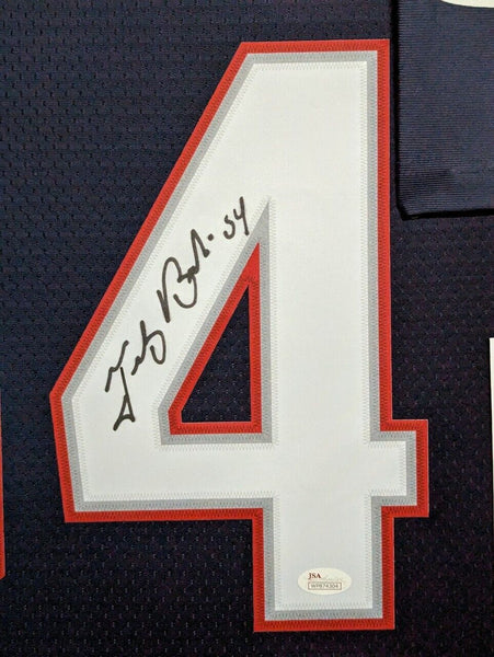 Custom Framed Tedy Bruschi New England Patriots style custom jersey.JSA COAThe authentication is from JSA. This signature is WITNESSED by a representative of JSA! 100% AUTHENTIC!!! The jersey has fully stitched numbers on the front and back. It is a great item and a must for all great sports fans!This item is professionally framed, it measures 32"x40" inside , 42"x34" outside , using UV protective Acrylic glass for safe keeping and safe transport, team color matting, black moulding and hanging hooks on the back. All additional items in frame seen in pictures included. 100% ready to hang in your fan cave.
