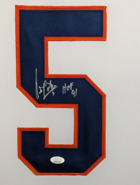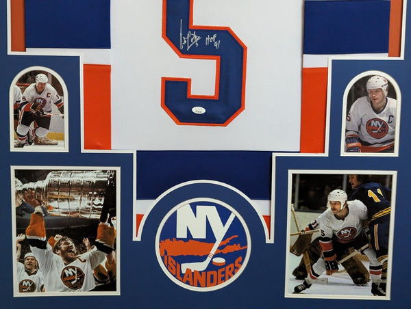 Custom Framed Denis Potvin hand signed New York Islanders custom jersey. JSA Hologram and COA The authentication is from JSA. This signature is WITNESSED by a representative of JSA! 100% AUTHENTIC!!! The jersey has fully stitched numbers on the front and back. It is a great item and a must for all great sports fans! This item is professionally framed, it measures 32"x40" inside , 42"x34" outside , using UV protective Acrylic glass for safe keeping and safe transport, team color matting, black moulding and hanging hooks on the back. All additional items in frame seen in pictures included. 100% ready to hang in your fan cave.