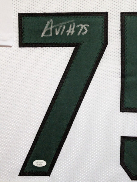 Custom Framed Alijah Vera-Tucker hand signed New York Jets style custom jerseyJSA Hologram and COAThe authentication is from JSA. This signature is WITNESSED by a representative of JSA! 100% AUTHENTIC!!! The jersey has fully stitched numbers on the front and back. It is a great item and a must for all great sports fans!Stock photos are used for auctions. Will receive equal quality.This item is professionally framed, it measures 32"x40" inside , 42"x34" outside , using UV protective Acrylic glass for safe keeping and safe transport, team color matting, black moulding and hanging hooks on the back. All additional items in frame seen in pictures included. 100% ready to hang in your fan cave.