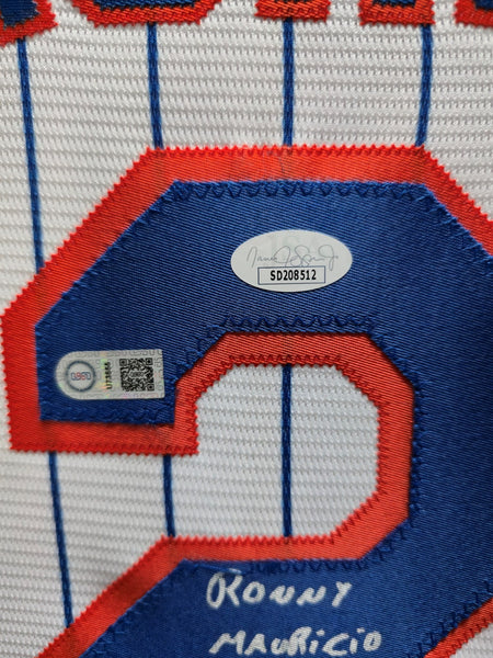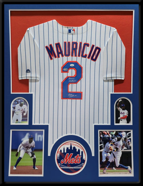 Custom Framed Ronny Mauricio hand signed New York Mets jersey.JSA COAThe authentication is from JSA. This signature is WITNESSED by a representative of JSA! 100% AUTHENTIC!!! The jersey has fully stitched numbers on the front and back. It is a great item and a must for all great sports fans!This item is professionally framed, it measures 32"x40" inside , 42"x34" outside , using UV protective Acrylic glass for safe keeping and safe transport, team color matting, black moulding and hanging hooks on the back. All additional items in frame seen in pictures included. 100% ready to hang in your fan cave.