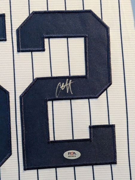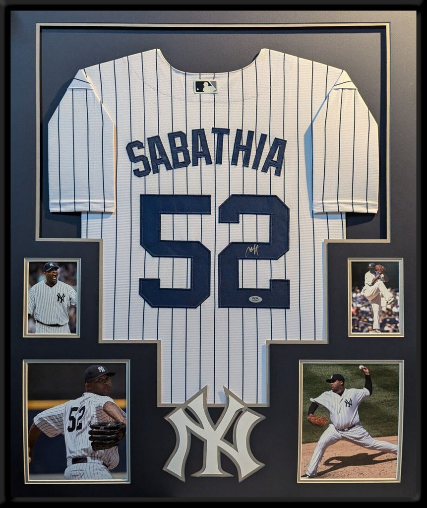 Custom Framed CC Sabathia hand signed New York Yankees jersey.PSA COAThe authentication is from PSA. This signature is authenticated by a representative of PSA! 100% AUTHENTIC!!! The jersey has fully stitched numbers on the front and back. It is a great item and a must for all great sports fans!This item is professionally framed, it measures 32"x40" inside , 42"x34" outside , using UV protective Acrylic glass for safe keeping and safe transport, team color matting, black moulding and hanging hooks on the back. All additional items in frame seen in pictures included. 100% ready to hang in your fan cave.