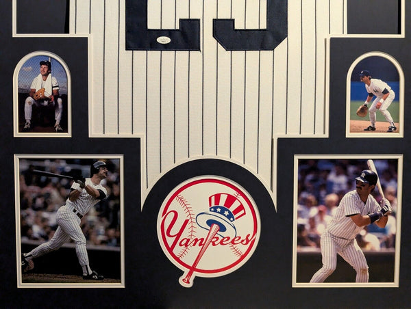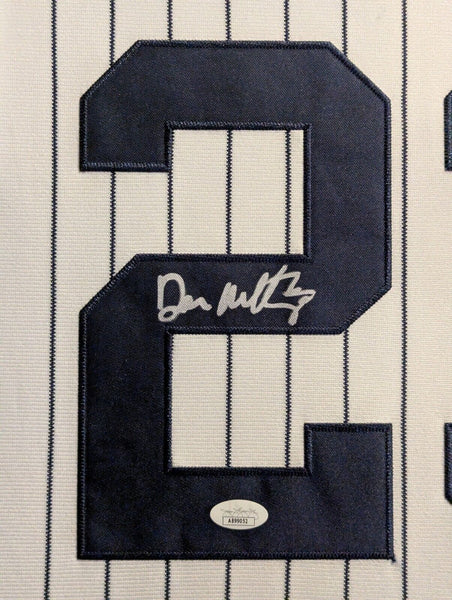 Custom Framed Don Mattingly hand signed New York Yankees style custom jersey.JSA Hologram and COAThe authentication is from JSA. This signature is authenticated by a representative of JSA! 100% AUTHENTIC!!! The jersey has fully stitched numbers on the front and back. It is a great item and a must for all great sports fans!This item is professionally framed, it measures 32"x40" inside , 42"x34" outside , using UV protective Acrylic glass for safe keeping and safe transport, team color matting, black moulding and hanging hooks on the back. All additional items in frame seen in pictures included. 100% ready to hang in your fan cave.