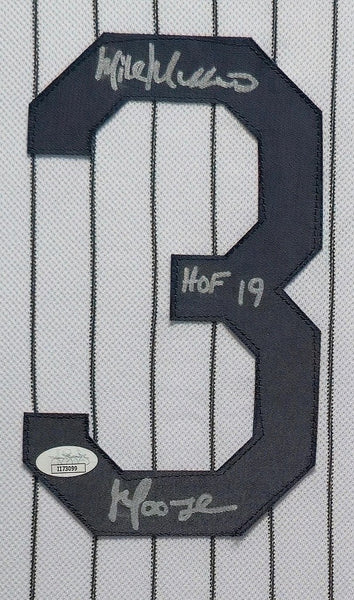 Custom Framed Mike Mussina hand signed New York Yankees jersey.JSA COAThe authentication is from JSA. This signature is authenticated by a representative of JSA! 100% AUTHENTIC!!! The jersey has fully stitched numbers on the front and back. It is a great item and a must for all great sports fans!This item is professionally framed, it measures 32"x40" inside , 42"x34" outside , using UV protective Acrylic glass for safe keeping and safe transport, team color matting, black moulding and hanging hooks on the back. All additional items in frame seen in pictures included. 100% ready to hang in your fan cave.