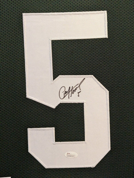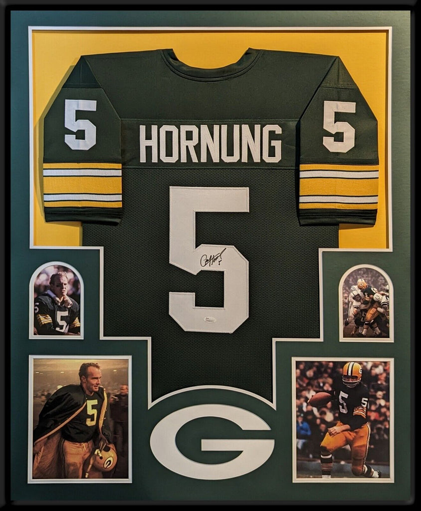 Framed Paul Hornung signed Green Bay Packers Custom Jersey. JSA Hologram and COA(#WP285152) The authentication is from JSA. This signature is not authenticated by opinion, but is WITNESSED by a representative of JSA! 100% AUTHENTIC!!! The jersey has fully stitched numbers on the front and back. No tags or logos. This is not an official NFL jersey but it is very high quality. It is a great item and a must for all great sports fans! This item is professionally framed, it measures 32"x40" inside , 42"x34" outside , using UV protective Acrylic glass for safe keeping and safe transport, team color matting, black moulding and hanging hooks on the back. All additional items in frame seen in pictures included. 100% ready to hang in your fan cave.