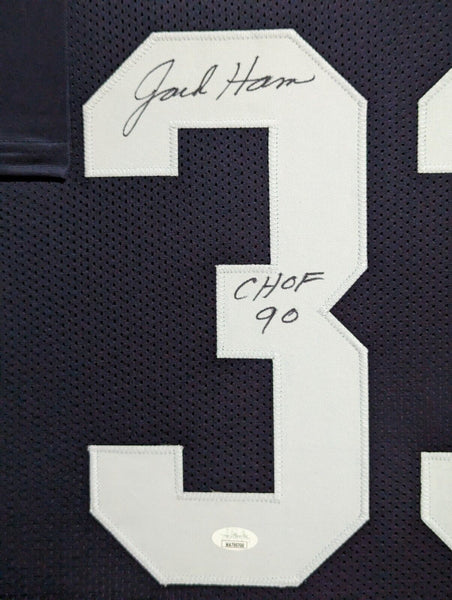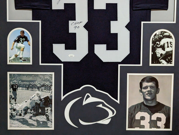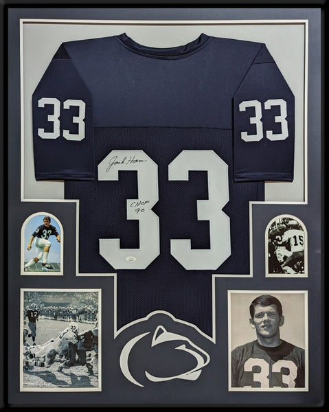 Custom Framed Jack Ham hand signed Penn State Nittany Lions style custom jersey."CHOF 90" Inscribed JSA COA The authentication is from JSA. This signature is authenticated by a representative of JSA! 100% AUTHENTIC!!! The jersey has fully stitched numbers on the front and back. It is a great item and a must for all great sports fans! This item is professionally framed, it measures 32"x40" inside , 42"x34" outside , using UV protective Acrylic glass for safe keeping and safe transport, team color matting, black moulding and hanging hooks on the back. All additional items in frame seen in pictures included. 100% ready to hang in your fan cave.
